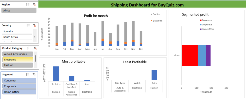 - Regional Performance: The dashboard’s regional breakdown offers an in-depth look at sales and profit performance across different countries within Africa. This granular view facilitates tailored strategies for each market, ensuring that efforts are aligned with regional preferences and economic conditions.