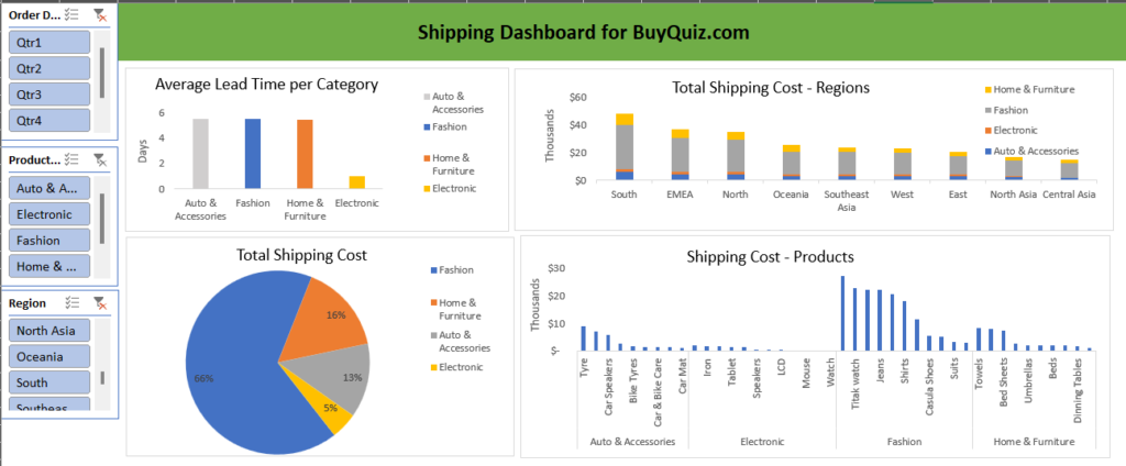The Shipping Dashboard for BuyQuiz.com, a pseudonym for a leading e-commerce platform, offers a detailed and interactive view of sales, profitability and shipping costs with lead times across various product categories and regions.