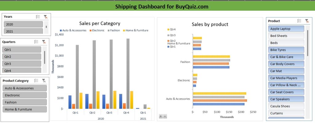 - Sales per Category: The dashboard highlights a significant trend in sales for Auto & Accessories versus Electronic products. In 2020, Auto & Accessories consistently outperformed Electronic items, with Qtr2 and Qtr3 demonstrating peak sales exceeding $1,200,000. Fashion and Home & Furniture also showed strong sales, particularly in Qtr4 of 2020.